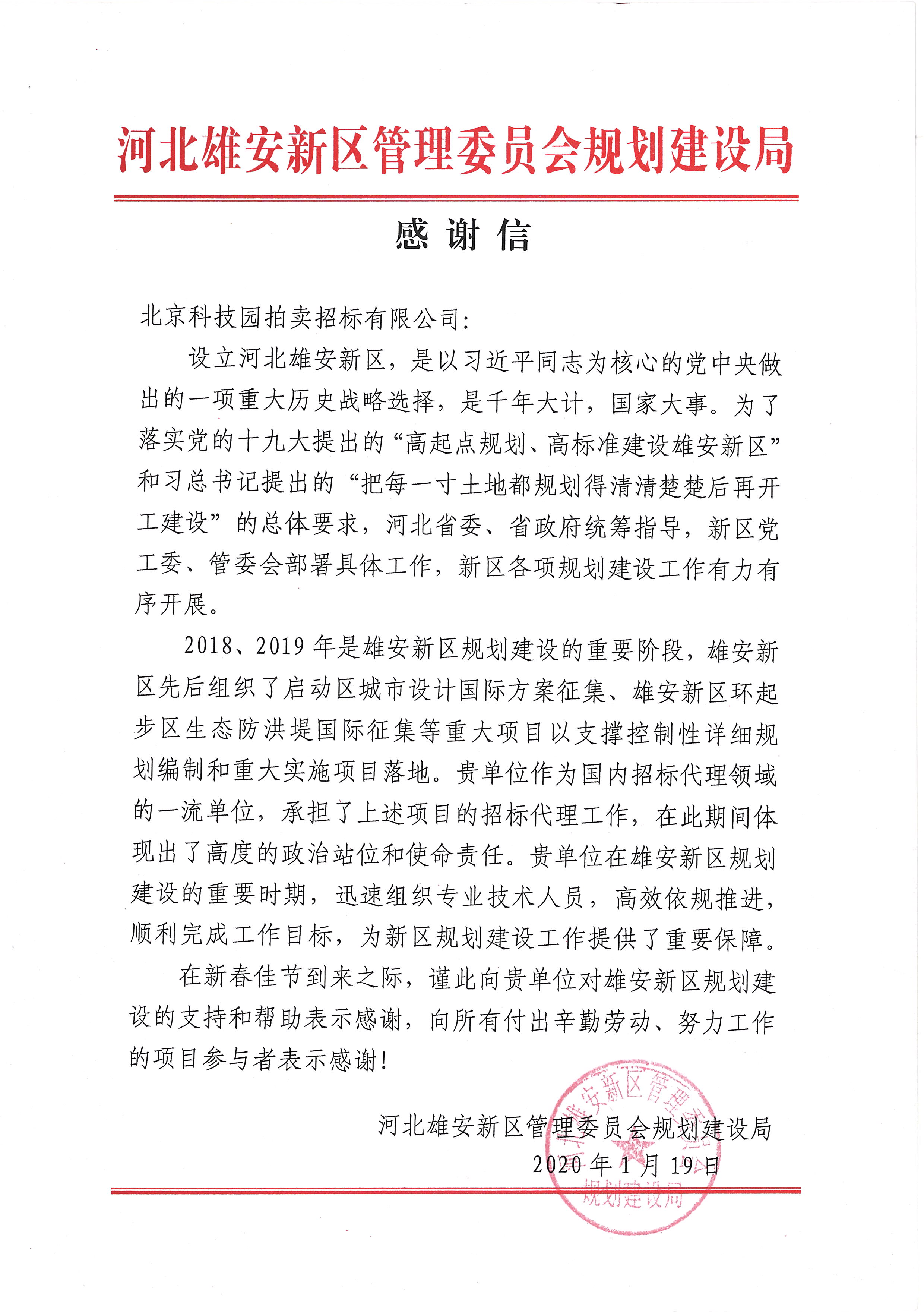 雄安新區(qū)管委會規(guī)建局感謝信